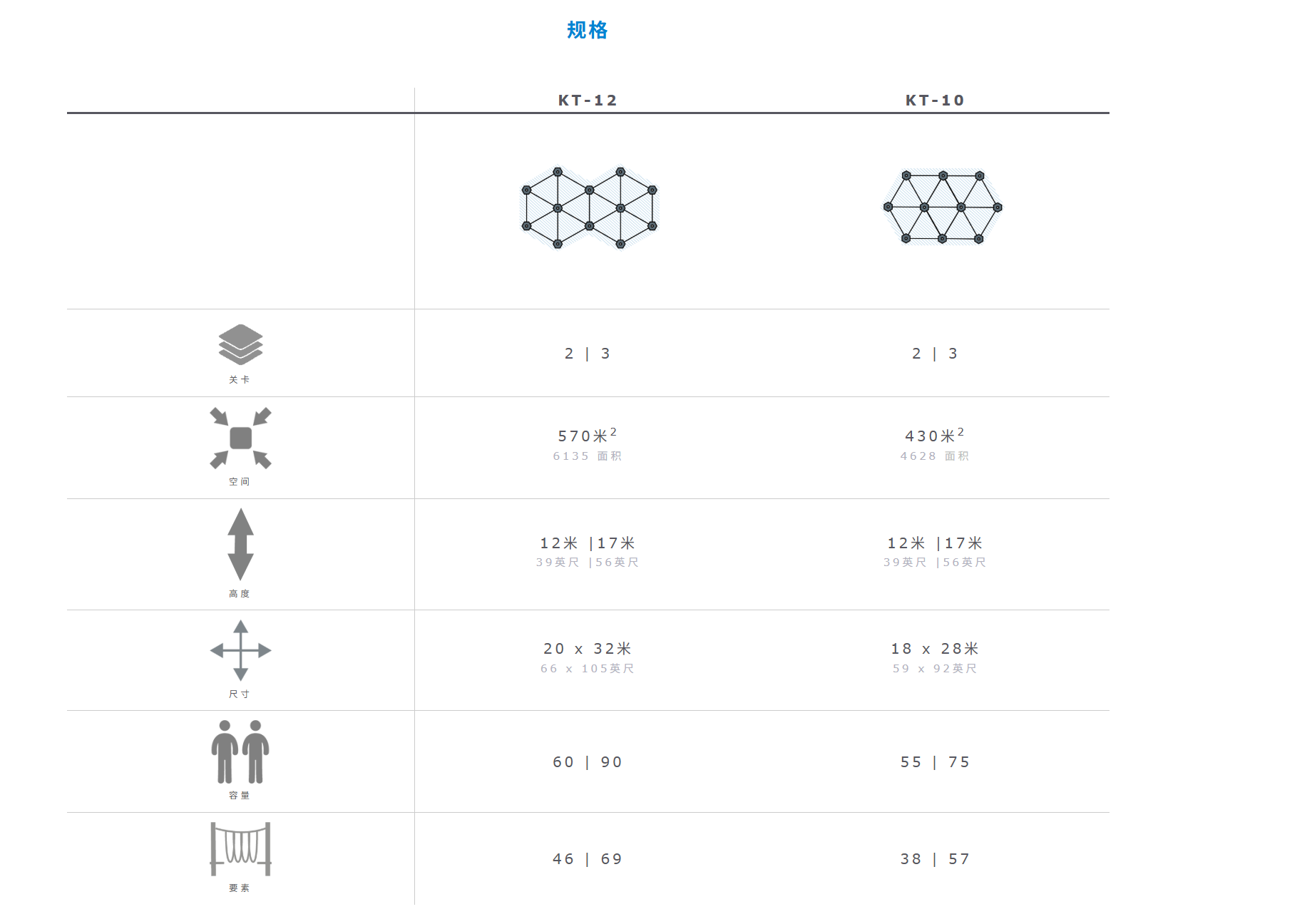 KT-12和KT-10是我们高空绳索赛道模型中的全能选手。它们巧妙地结合了大型高空绳索赛道的多功能性与小型型号的节省空间和高效的特点。