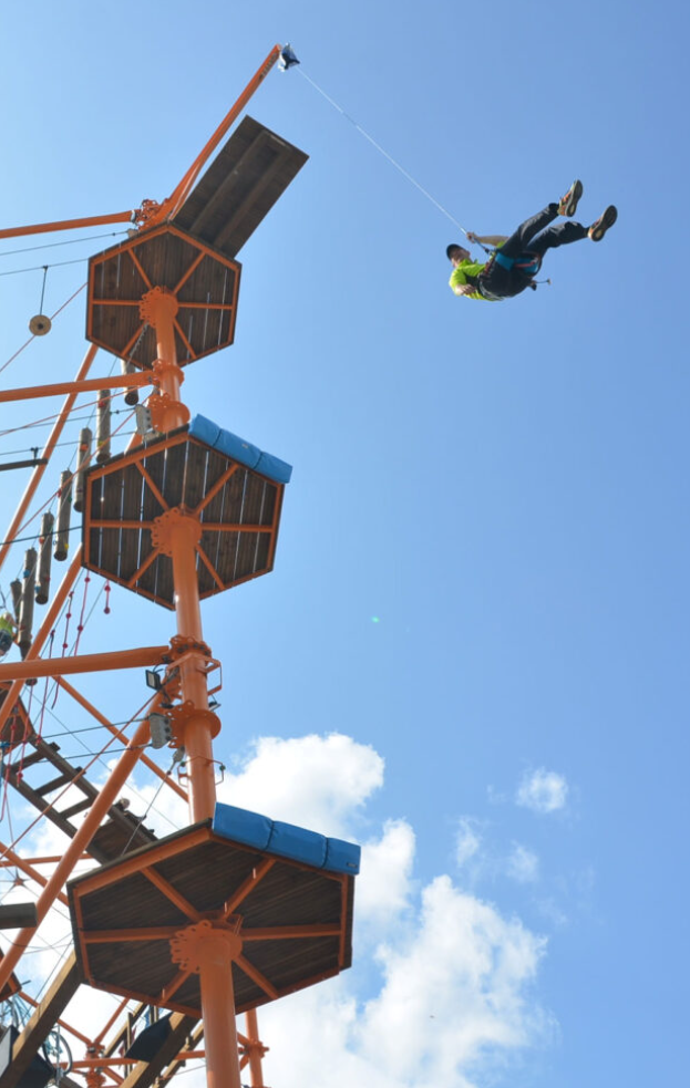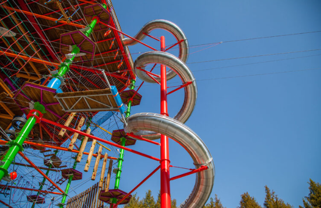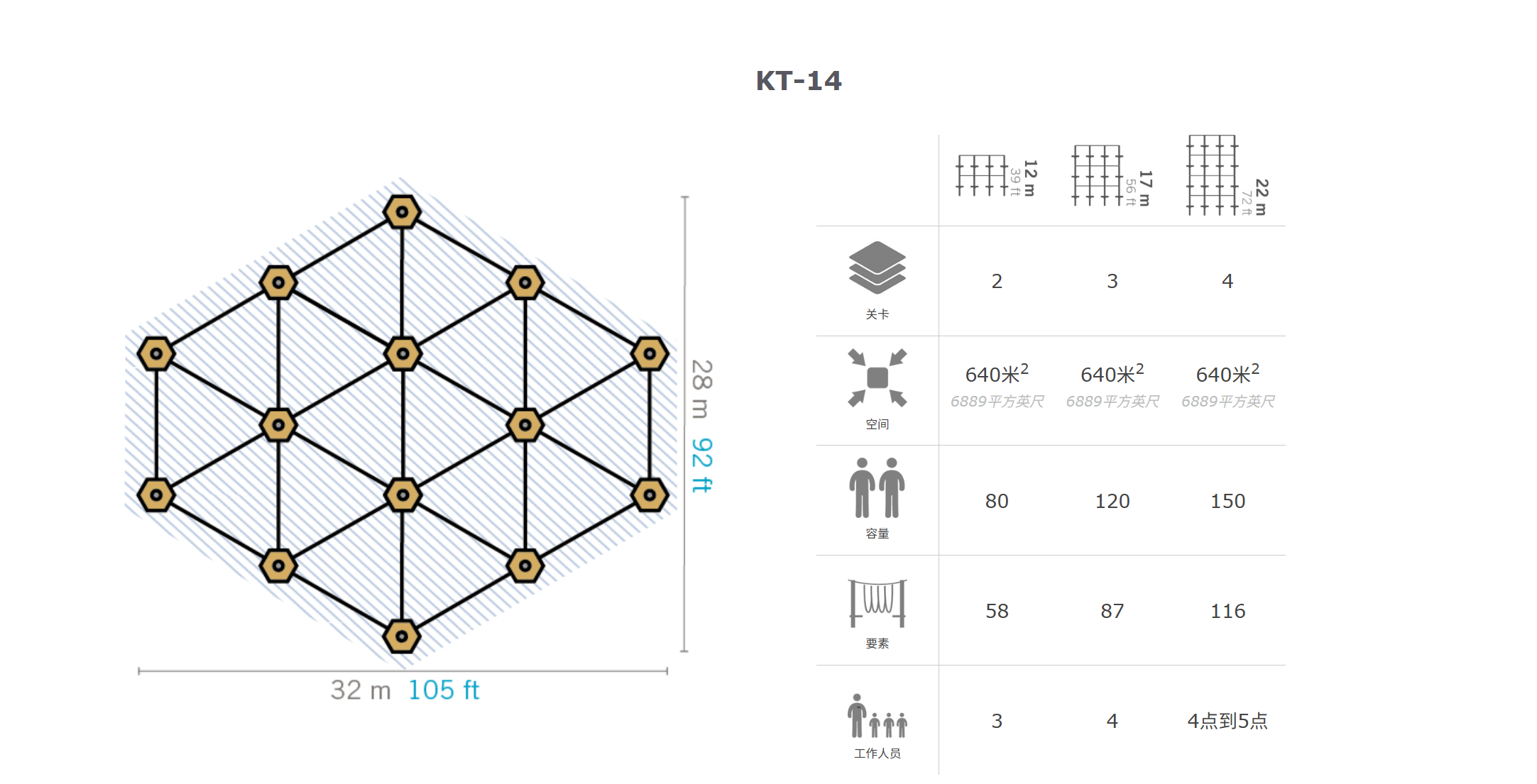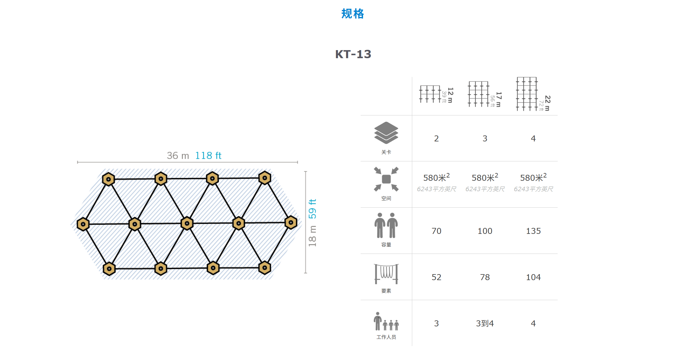 我们的高效款模型,是经典高空绳索运动的省空间优选:其访客承载量与KT-18型号近乎持平,占地面积却仅需约三分之二。KT-13与KT-14两款型号均可拓展至4层,亦可打造为区域标志性地标。该设计最大化利用空间布局,无需设置中央步道平台,尤其适配狭长场地;结构顶部还可加装活动平台,既能作为游客观景平台,也能为攀登者提供休憩场所。