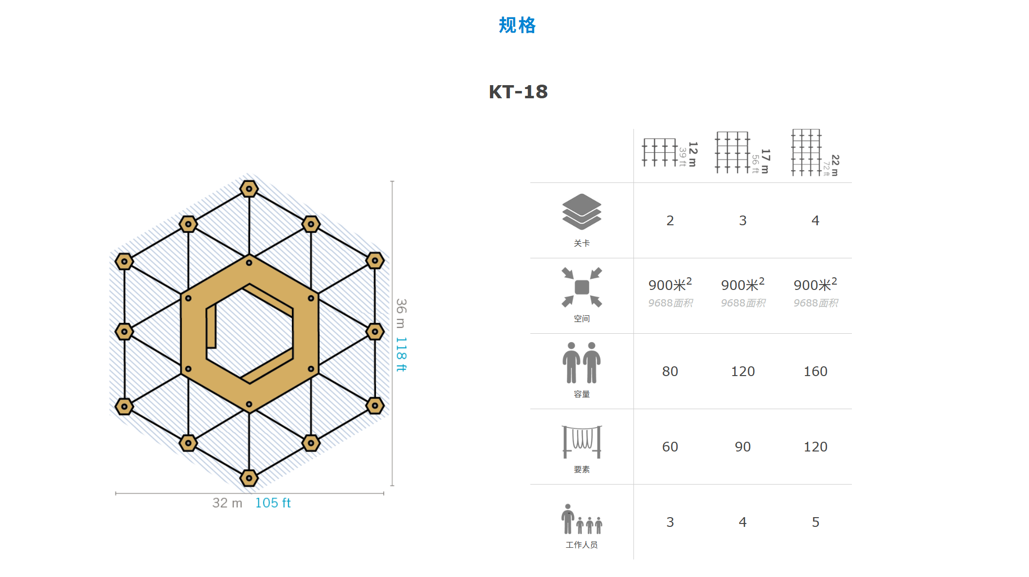 KT-18是我们高空绳索公园中的旗舰款。它特别适合作为标志性设施,或者说,成为整个地区的地标。这款标志性模型非常适合人流量大的场所,因为它可同时容纳多达160名攀岩者。这使得全天能有大量游客顺利体验。尽管如此,该模型因其节省空间的布局,仅需约900平方米的面积,因此在城市区域(如城市公园)也能完美安置。它可以向上增建至四层,从而达到高达22米的高度。配备观景平台后,高空绳索公园在攀岩运营时段之外还能进一步得到利用。此外,与较小的款型不同,该模型还可在结构中心加装更多平台。